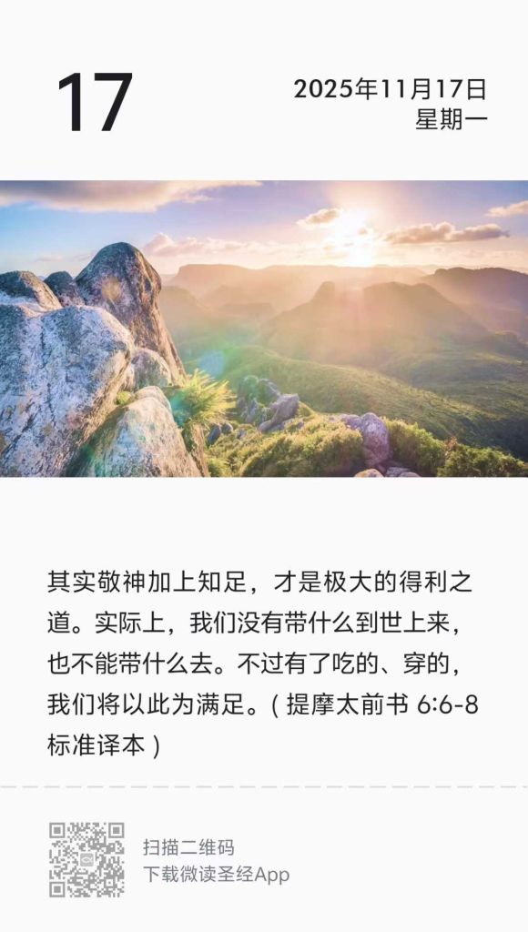 其实敬神加上知足,才是极大的得利之道。实际上,我们没有带什么到世上来,也不能带什么去。不过有了吃的、穿的,我们将以此为满足。至于那些想发财的人就会陷入试探、网罗以及很多无知有害的欲望里;这些欲望使人沉溺在败坏和灭亡中。 要知道,贪爱金钱是万恶之根;有些人恋慕金钱,就被迷惑而离开了信仰,用很多苦痛把自己刺透了。至于你,哦,属神的人哪,你要逃避这些事!你要追求公义、敬神、信仰、爱心、忍耐、温柔,要为信仰打那美好的仗,要抓住永恒的生命。你正是为此蒙召的,并且在许多见证人面前做了美好的告白。( 提摩太前书 6:6-12 标准译本 )