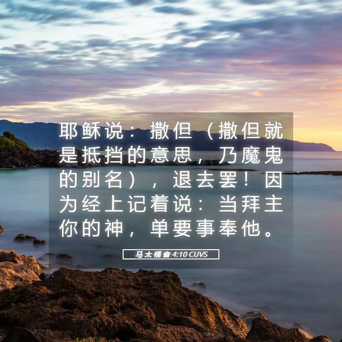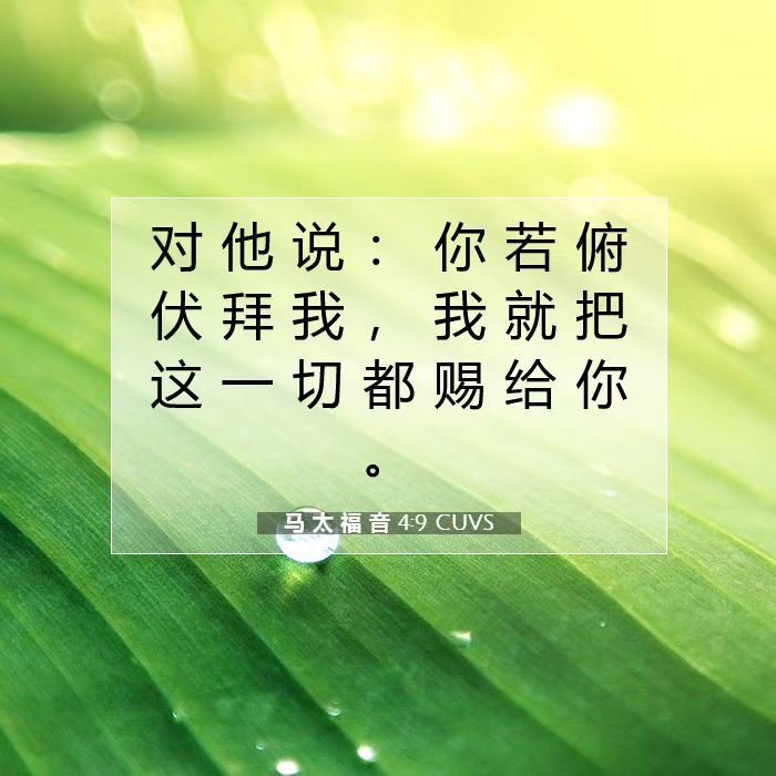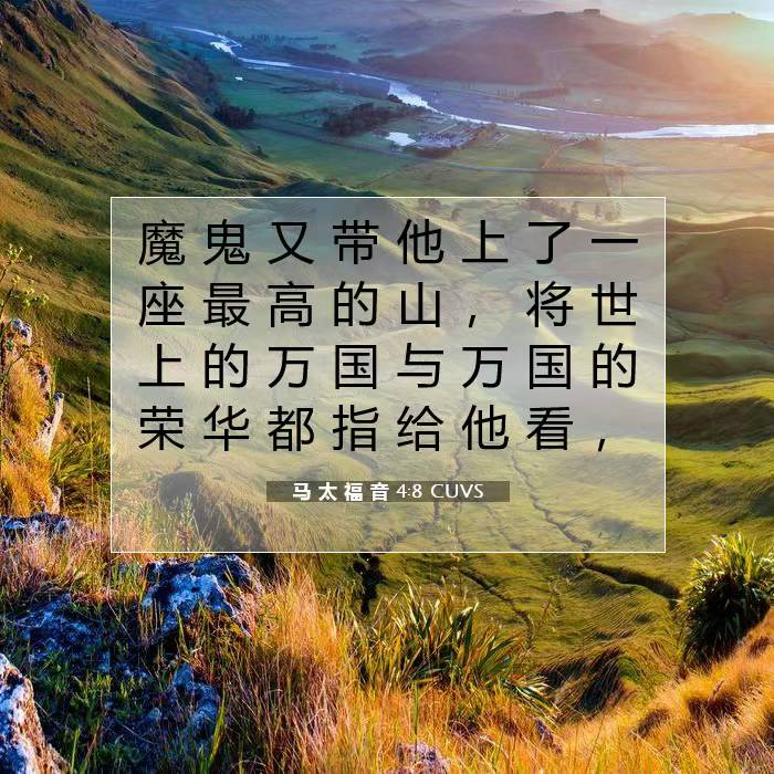 最后,魔鬼带耶稣上了一座极高的山,把世界各国和各国的荣华都指给他看。 并且对他说:“你只要跪下来拜我,我就把这一切都给你。” 但耶稣说:“撒但,走开!经上记着:‘当拜主你的 神,单要事奉他。’” ( 马太福音 4:8-10 新译本 )