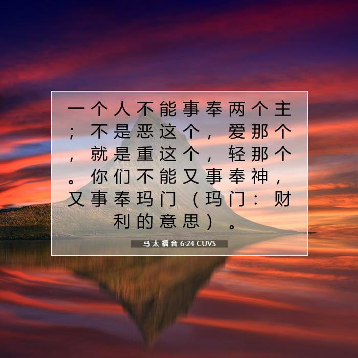 圣经教导我们不能又侍奉神,又侍奉玛门,核心就是提醒我们:内心要专一信靠独一真神,让祂完全作主,而不是只让祂掌管我们生命的一部分。人不可能一半跟随神,一半跟随世界与那恶者,忠心只能归给一位