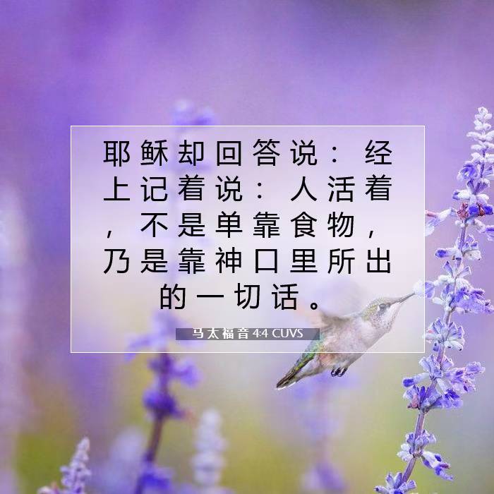 • 当你饥饿、疲惫、焦虑、或者遭遇疾病,逼迫,或者各种困难时,想走捷径时,记得:人活着不是单靠食物,而是靠神的话。神的话就是真理,是生命,是道,是指南针,是根基。