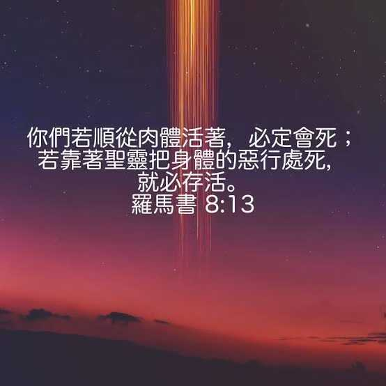 因为你们如果顺着肉体而活,就将死去;但如果顺着圣灵治死身体的所作所为,就将活着。 原来,凡是蒙神的灵带领的人,他们才是神的儿女。 ( 罗马书 8:13-14 标准译本 )