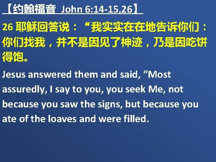 耶稣回答说:“我实实在在地告诉你们,你们找我,并不是因见了神迹,乃是因吃饼得饱。 不要为那必坏的食物劳力,要为那存到永生的食物劳力,就是人子要赐给你们的,因为人子是父 神所印证的。” (约翰福音 6:26-27 和合本)