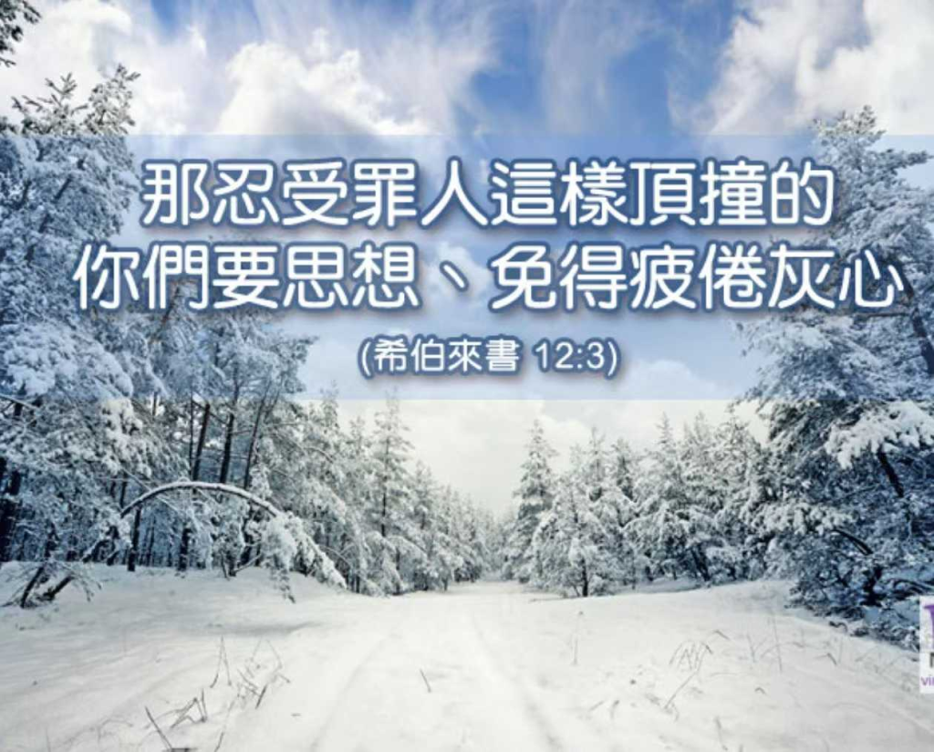 忍受罪人的攻击,忍受罪的缠绕,忍受主的管教,忍受痛苦,这一切的遭遇主也同样忍受过,主说让我们不要灰心,不灰心就是不放弃的意思,主嘱咐我们当遭遇这一切的时候不要放弃。