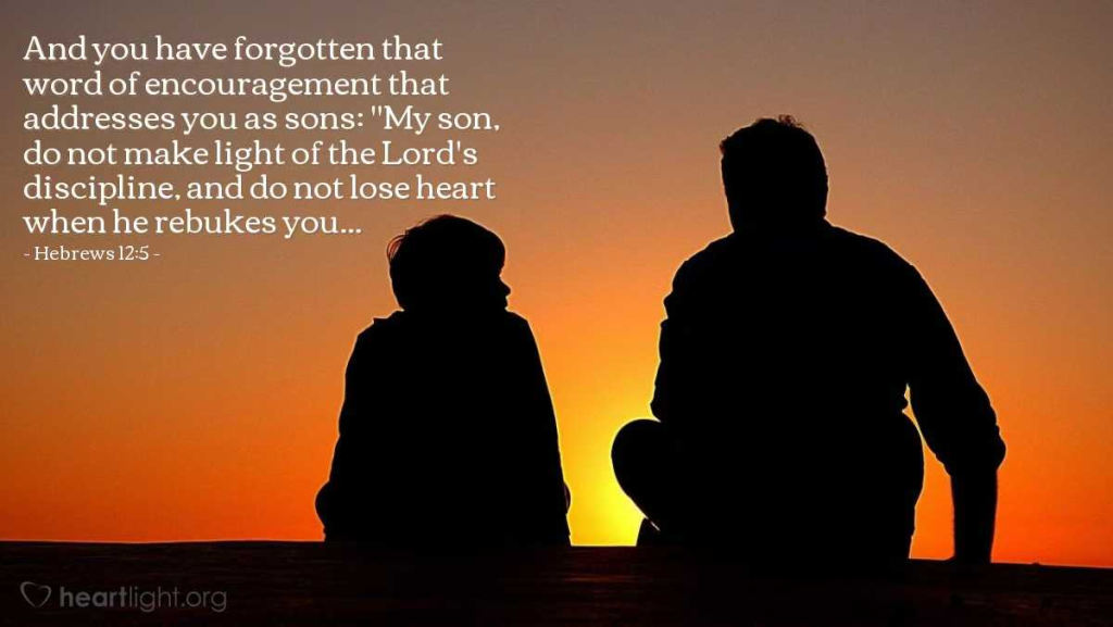 所以,我们既然有这么多的见证人,像云彩围绕着我们,就应该脱下各样的拖累,和容易缠住我们的罪,以坚忍的心奔跑那摆在我们面前的赛程; 专一注视耶稣,就是那位信心的创造者和完成者。他因为那摆在面前的喜乐,就忍受了十字架,轻看了羞辱,现在就坐在 神宝座的右边。 这位忍受罪人那样顶撞的耶稣,你们要仔细思想,免得疲倦灰心。你们与罪恶斗争,还没有对抗到流血的地步; 你们又忘记了那劝你们好像劝儿子的话,说:“我儿!你不可轻看主的管教,受责备的时候也不要灰心;因为主所爱的,他必管教,他又鞭打所收纳的每一个儿子。”为了接受管教,你们要忍受,因为 神待你们好像待儿子一样;哪有儿子不受父亲管教的呢? ( 希伯来书 12:1-7 新译本 )