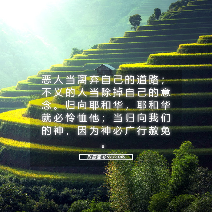 邪恶的人要离弃自己的道路,作恶的人要撇弃自己的意念;他们当回转归向耶和华,耶和华就必怜悯他们;当回转归向我们的神,因为神必广施赦免。( 以赛亚书 55:7 标准译本 )