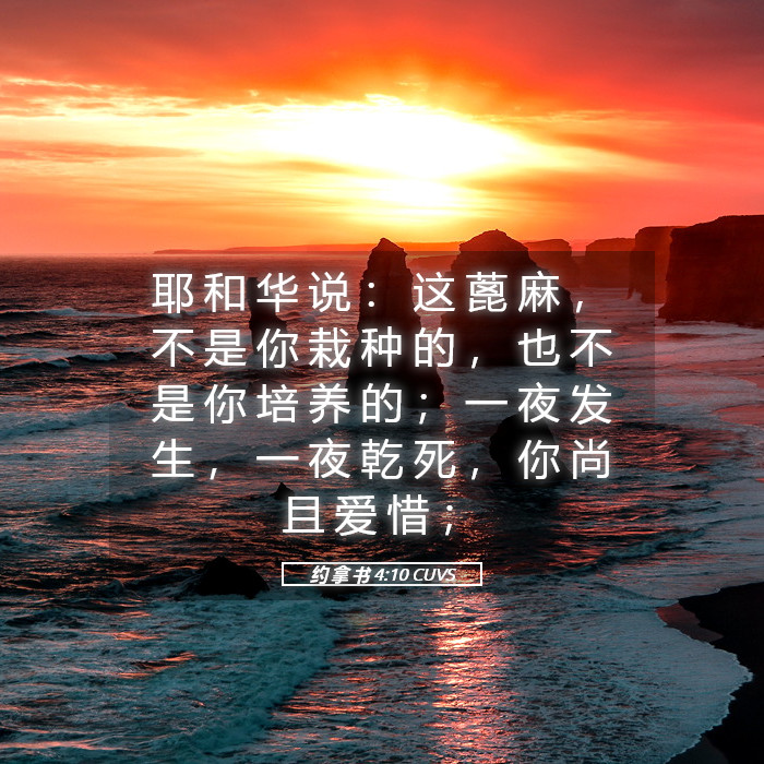 约拿从那城出来,在城的东边坐下。他在那里为自己搭了一个棚子,就坐在棚荫下,要看看那城会发生什么事。 耶和华神指派了一棵蓖麻,使它长起来高过约拿,为他的头遮荫,好解脱他的苦恼。于是约拿因这棵蓖麻而欢喜,大大喜乐。 次日天亮的时候,神却指派了一条虫子来咬这棵蓖麻,蓖麻就枯干了。太阳升起的时候,神又指派了炎热的东风;太阳直射在约拿的头上,他就发昏。于是他为自己求死,说:“我死了比活着更好。”神对约拿说:“你因这棵蓖麻就这样恼火,难道有理吗?”约拿说:“我恼火得要死,当然有理!”耶和华说:“这棵蓖麻,你没有为它劳力,也没有使它长大,它一夜之间出现,一夜之间消亡——你尚且顾惜它, 更何况尼尼微大城,其中有超过十二万人不能分辨自己的左右手,还有许多牲畜,我难道不顾惜吗?”( 约拿书 4:5-11 标准译本 )
