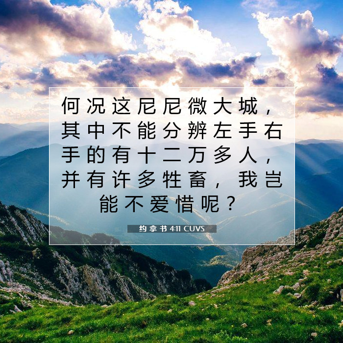 约拿书很直观的记录了约拿的狭隘和爱憎分明,也记录了神的怜悯和恩典,神真的是广施赦免的那一位。神并非完全不顾惜罪人,祂给人悔改的机会,只要悔改归正,离弃罪行,耶和华必怜悯他们。正如神最后对约拿说:“这棵蓖麻,你没有为它劳力,也没有使它长大,它一夜之间出现,一夜之间消亡——你尚且顾惜它, 更何况尼尼微大城,其中有超过十二万人不能分辨自己的左右手,还有许多牲畜,我难道不顾惜吗?”