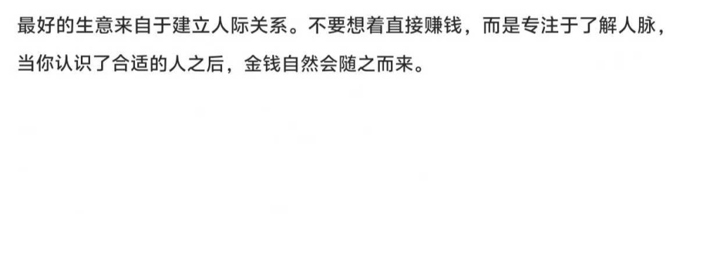 最好的生意来自于建立人际关系。不要想着直接赚钱,而是专注于了解人脉,当你认识了合适的人之后,金钱自然会随之而来。