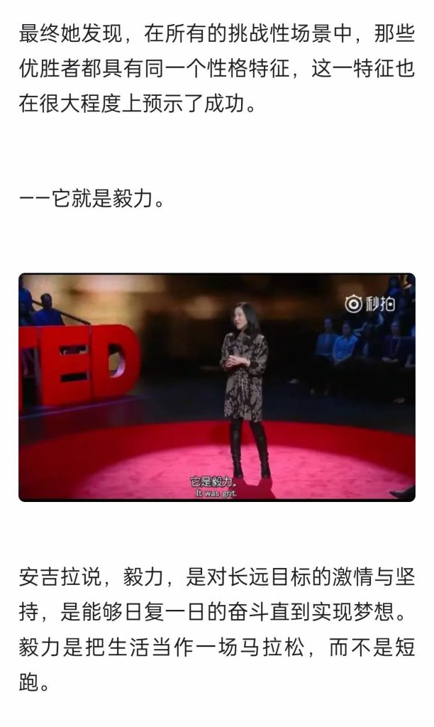 我想这也是安吉拉对毅力,也是对成功最好的解读。失败和挫折并不可怕,先天条件不足也没问题,最重要的就是对目标和梦想的不懈追求,不要因挫败而恐惧放弃,止步不前!
