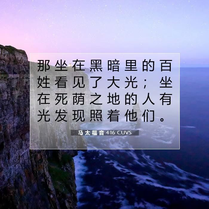 “西布伦地、拿弗他利地,沿海之路,约旦河外,外族人的加利利啊!住在黑暗中的人民,看见了大光;死亡幽暗之地的居民,有光照亮他们。” 从那时起,耶稣就开始传道,说:“天国近了,你们应当悔改。”( 马太福音 4:15-17 新译本 )