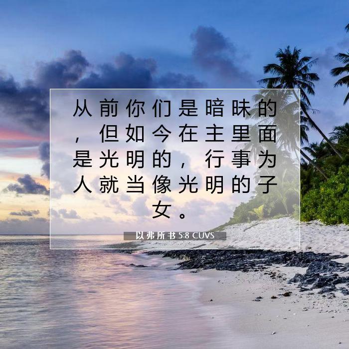 - 以弗所书 5:8:“从前你们是暗昧的,但如今在主里面是光明的,行事为人就当像光明的子女。”