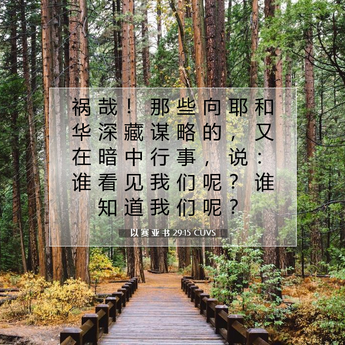 祸哉!那些向耶和华深深隐瞒计划的人!他们所做的都在黑暗之中,他们说:“谁会看见我们呢?谁会知道我们呢?”你们颠倒事理了!陶匠怎能被看作与陶泥一样?被造的怎能对造它的说:“他没有造我”?陶器怎能对陶匠说:“他什么也不知道”?( 以赛亚书 29:15-16 标准译本 )
