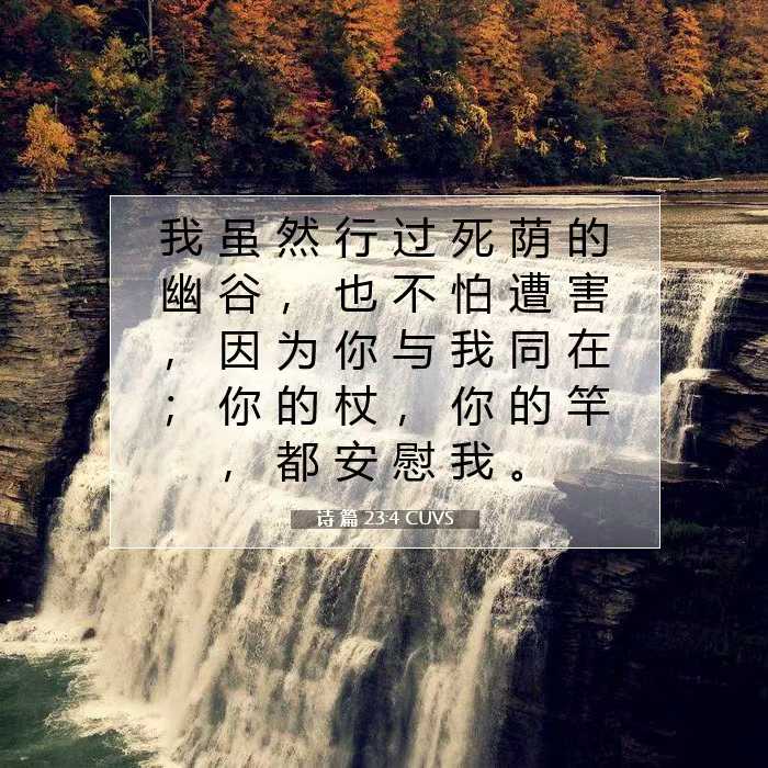 我纵然行过死荫的幽谷,也不怕遭害,因为你与我同在;你的杖、你的杆都安慰我。( 诗篇 23:4 标准译本 )